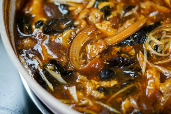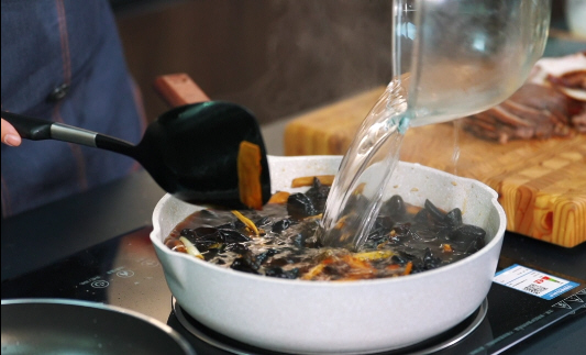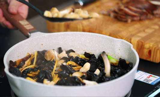 [图]2/8锅中加油,大火放入大料,姜片,半碗酱油;起泡以后加葱段,黄花木耳,大火煸炒,放入草菇