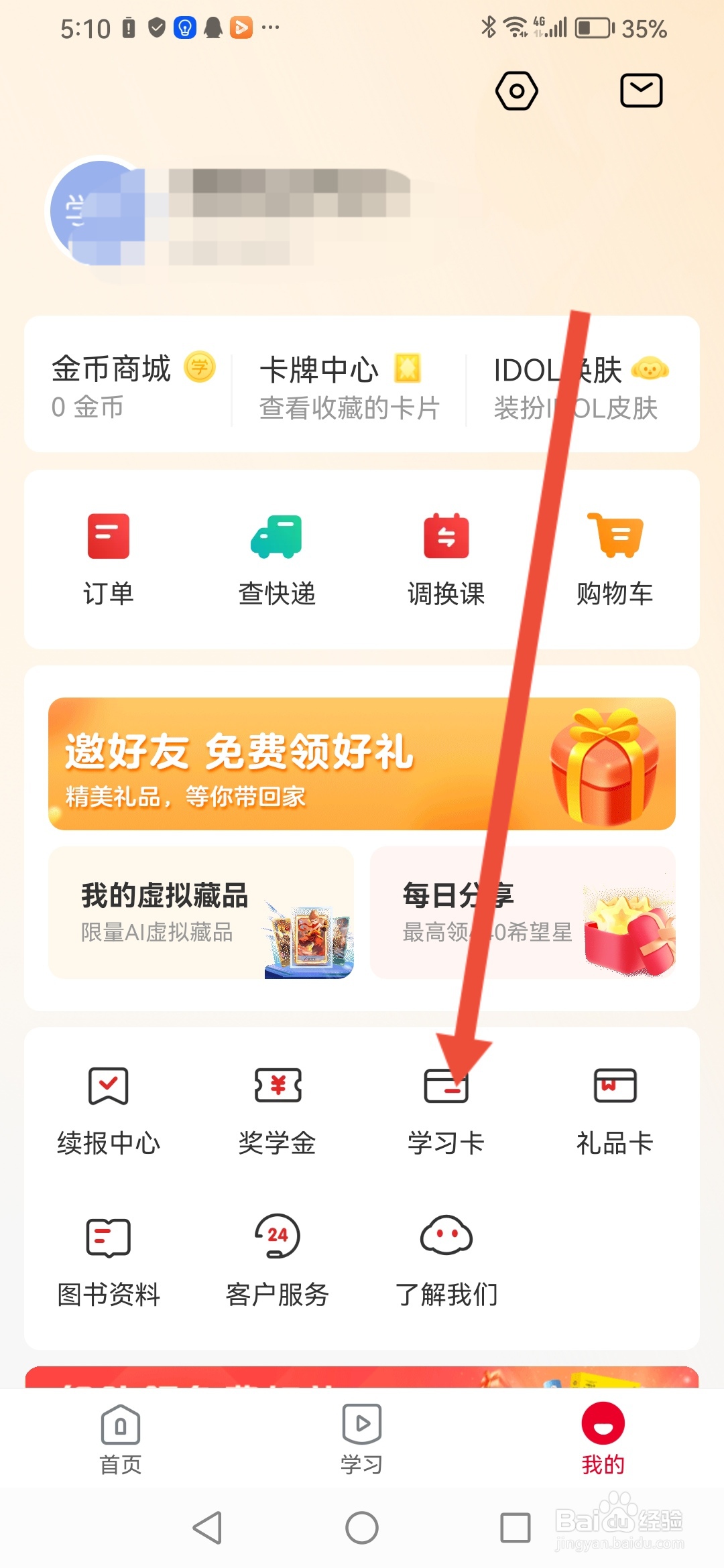 [图]3/5来到我的主页,点击【学习卡】。