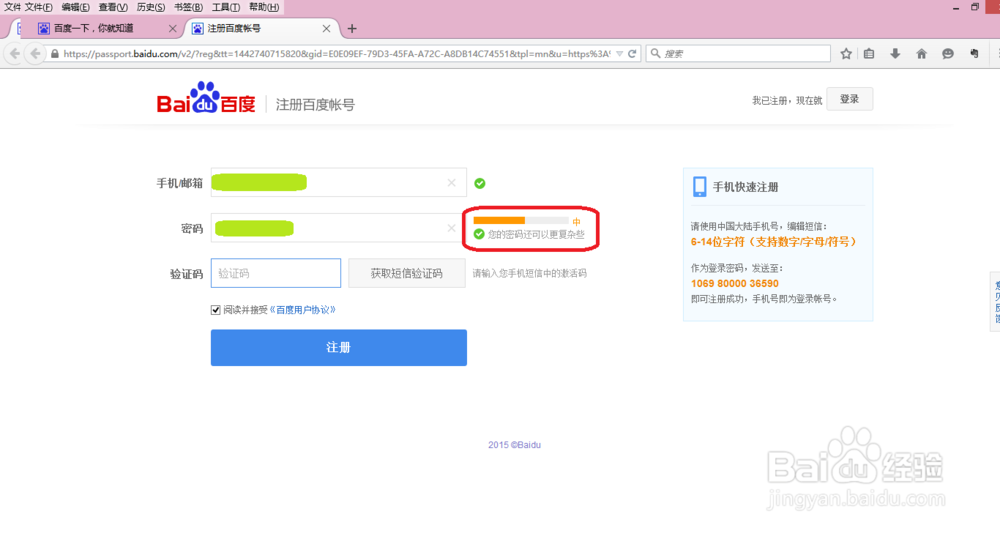 [图]5/7手机和密码填写完成后,左键点击下方的“获取短信验证码”,等待你的手机收到百度发来的验证码短信。