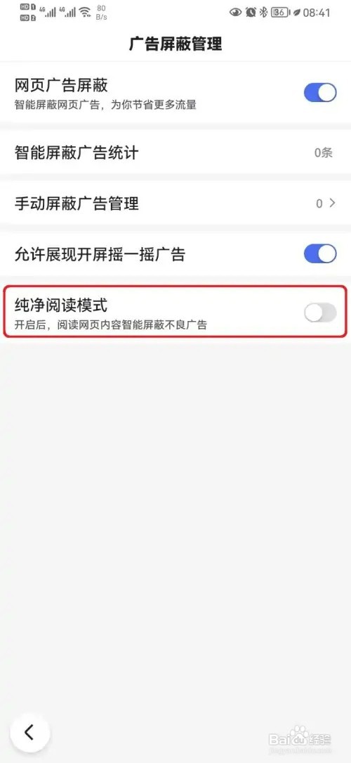 [图]3/3在广告屏蔽管理页面,开启【纯净阅读模式】。