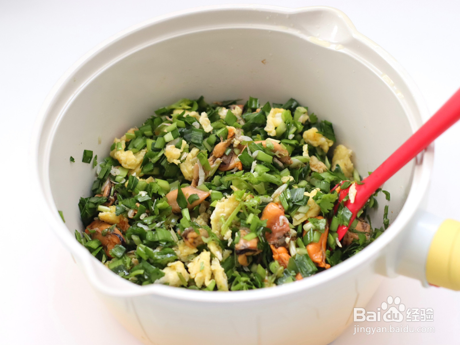 [图]7/16容器中放入切碎的韭菜和香菜,鸡蛋和虾皮,海虹肉。