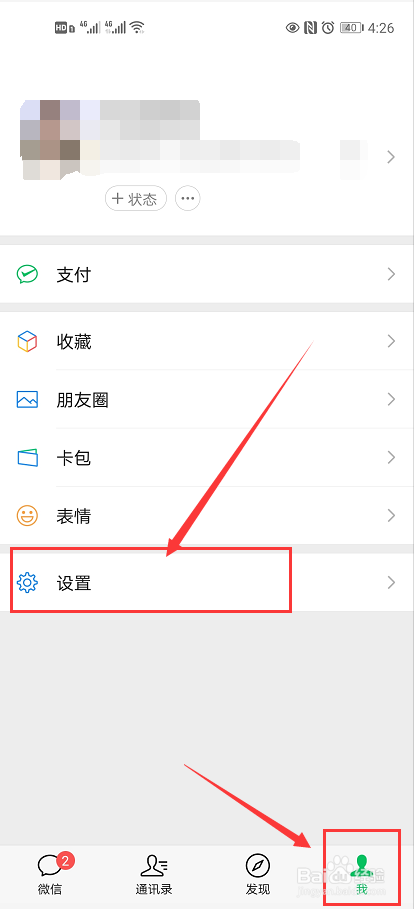 1/3分步阅读打开微信,选择右下角“我”,再选择“设置”进入,如图所示。