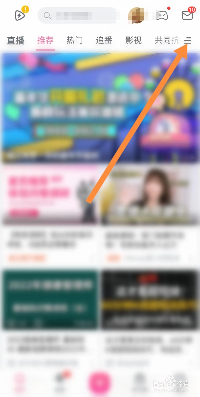 1/4分步阅读进入哔哩哔哩App首页,点击页面右上角“三条横线”图标。