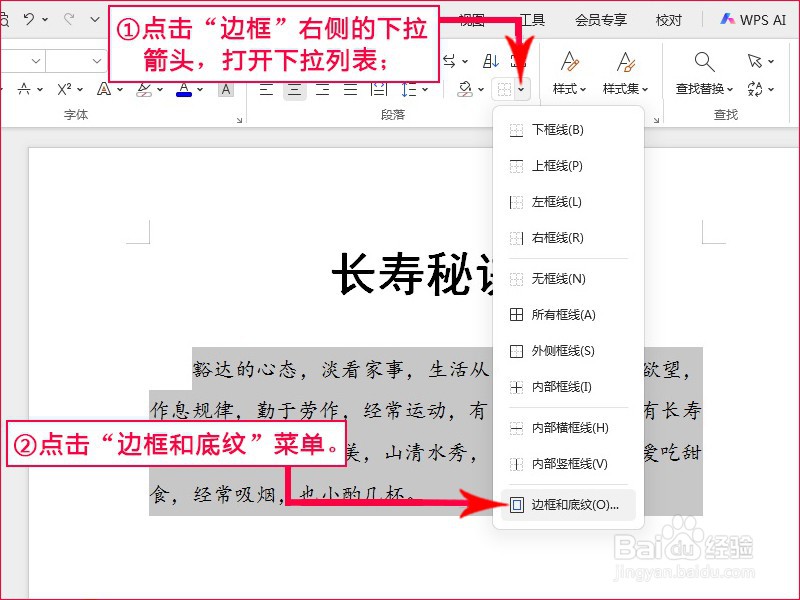 [图]4/7选择选项。点击“边框”右侧的下拉箭头,打开下拉列表;点击“边框和底纹”菜单。