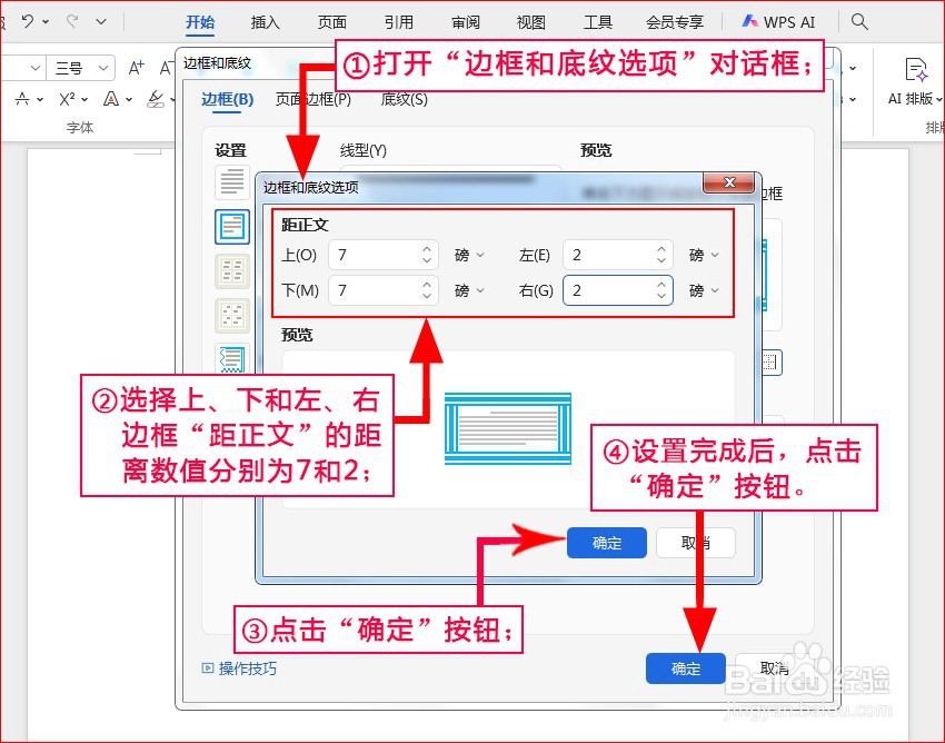 [图]6/7边距设置。打开“边框和底纹选项”对话框;选择上、下和左、右边框“距正文”的距离数值分别为7和2;点击“确定”按钮;设置完成后,点击“确定”按钮。