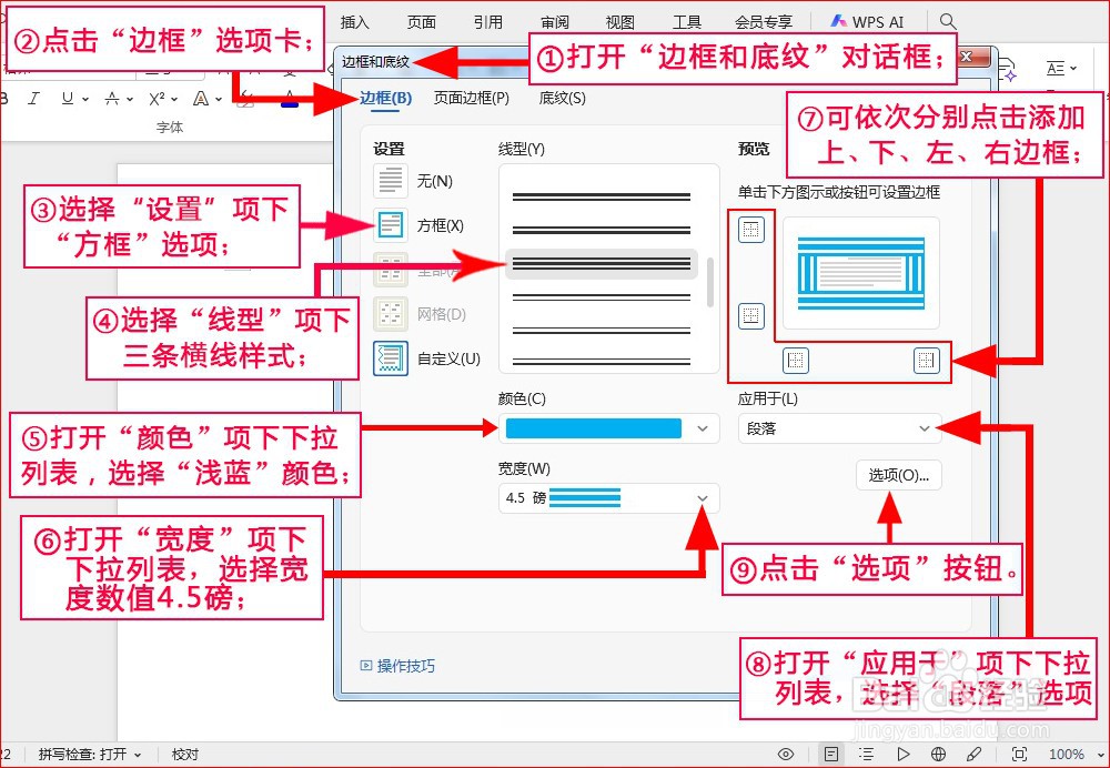[图]5/7边框设置。打开“边框和底纹”对话框;点击“边框”选项卡;选择“设置”项下“方框”选项;选择“线型”项下三条横线样式;打开“颜色”项下下拉列表,选择“浅蓝”颜色;打开“宽度”项下下拉列表,选择宽度数值4.5磅;可依次分别点击添加上、下、左、右边框;打开“应用于”项下下拉列表,选择“段落”选项;点击“选项”按钮。