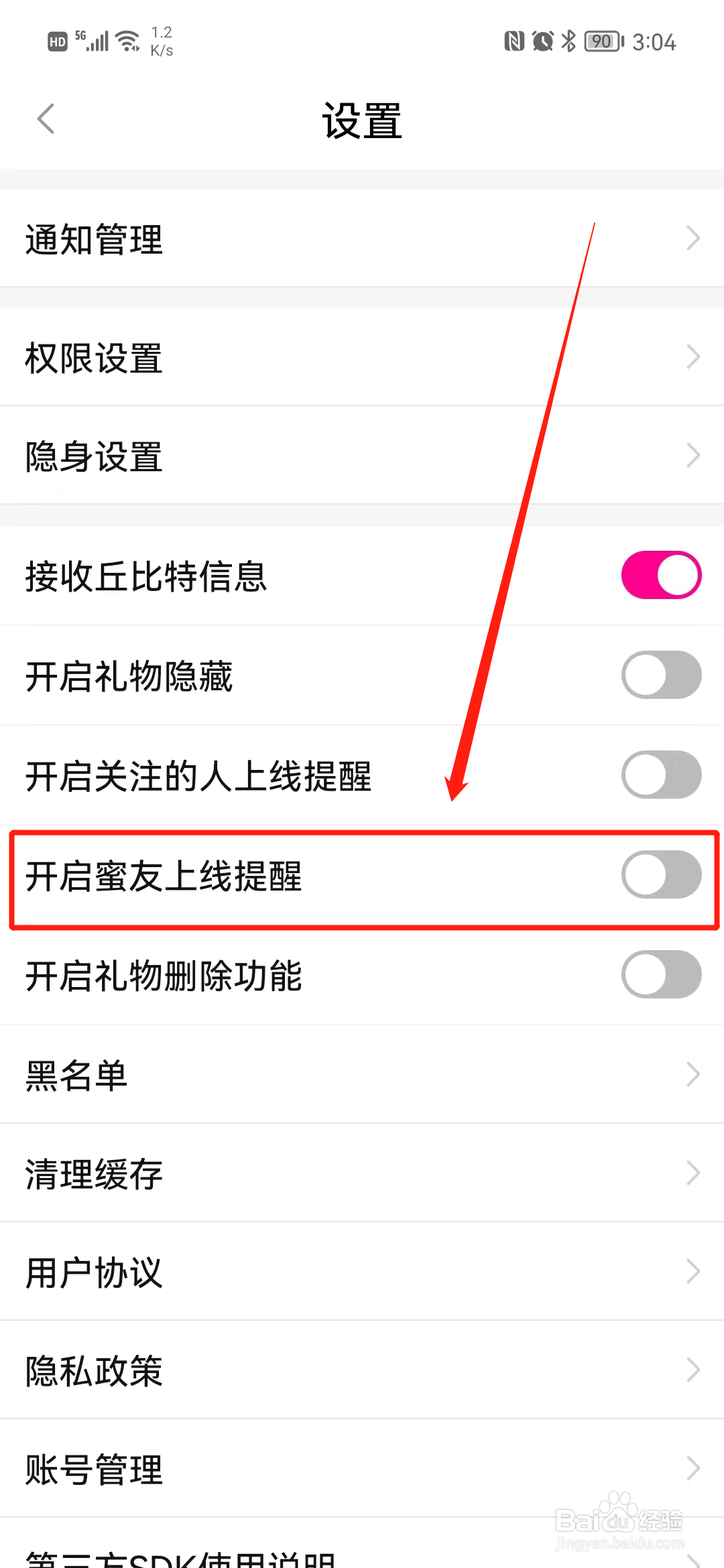 [图]3/3第三步:点击【开启密友上线提醒】后的圆形按钮,待显示红色即可,详见下图。