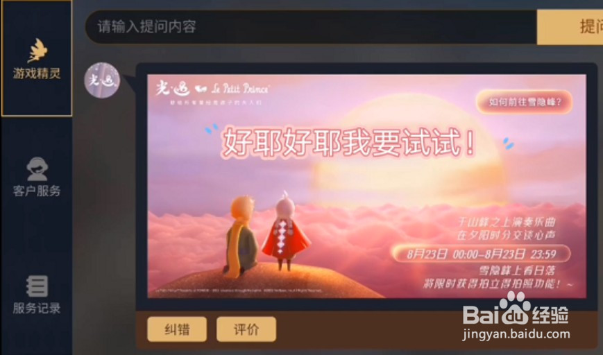 1/4分步阅读首先打开游戏精灵,在8月23日这天前往雪隐峰看日落,拍照会变成拍立得形式。