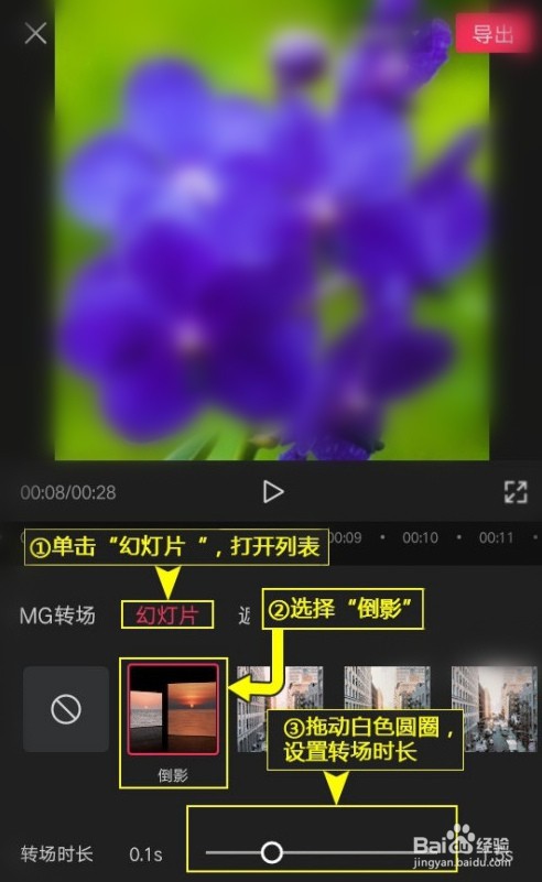 [图]6/6转场设置。单击“幻灯片”,打开列表,选择“倒影”,设置转场时长,点击“应用到全部”,最后点击右下角的“√”即可。
