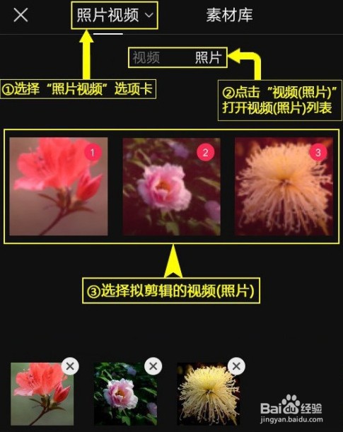 [图]4/6添加视频。选择“照片视频”选项卡,点击“视频(照片)”,打开视频(照片)列表,选择拟剪辑的视频(照片),点击“添加”。