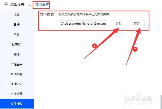 [图]3/3进入“接待设置”界面后,在“文件接收”选项中,可以查看到软件默认的文件存放位置,也可点击“更改”,按需另行设置路径位置,如图所示。