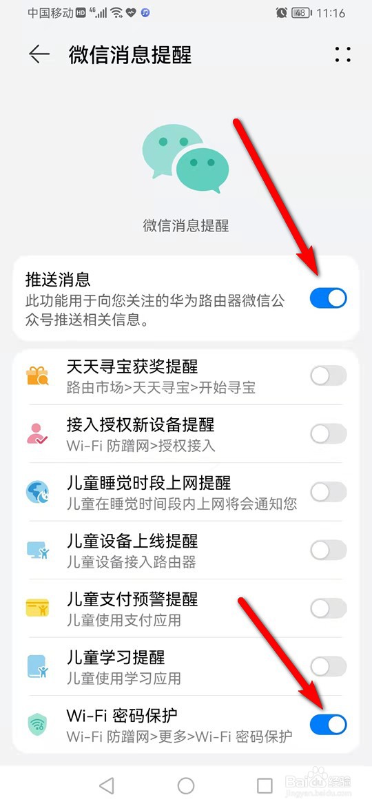 [图]9/9将“推送消息”旁小滑块点亮,再将“接入授权新设备提醒”旁的小滑块点亮即可实现陌生设备进入推送微信消息功能。