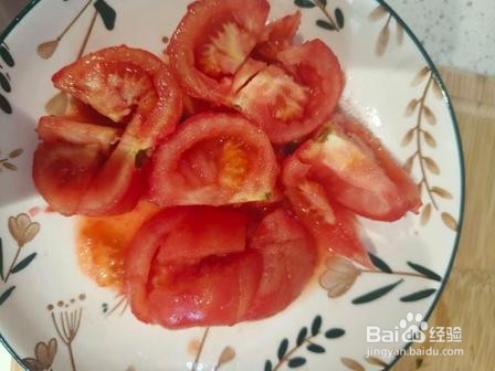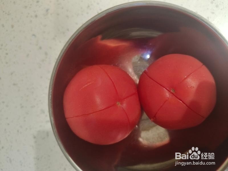 1/6分步阅读处理西红柿:在西红柿顶部打十字花刀,烧好开水,将西红柿放入烫 10 秒左右,捞出过凉水,然后撕去外皮。将西红柿一半切大丁,一半切小丁备用。