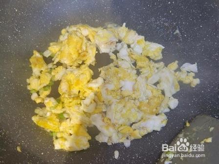炒鸡蛋:锅中倒入适量油,油热后下入蛋液,待蛋液开始凝固后,用锅铲划散,盛出备用