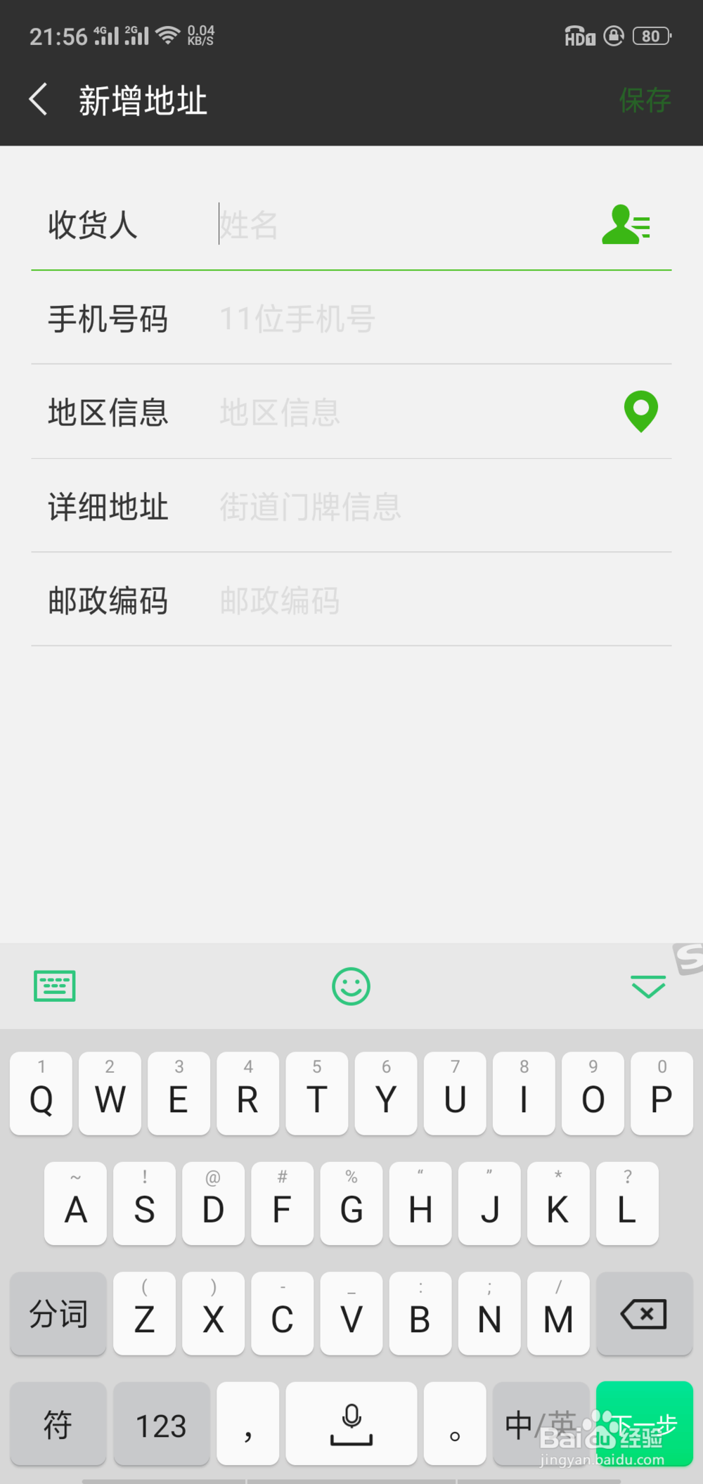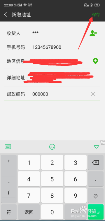 [图]6/6在进入新增地址主界面后,输入相应的信息后,点击右上角的保存,如下图,即可。