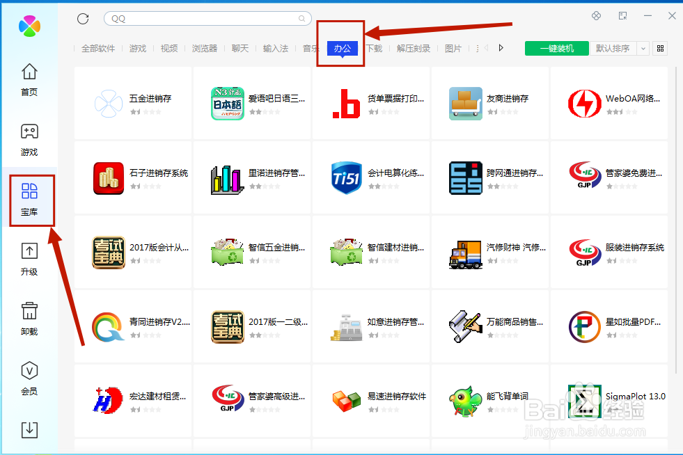 [图]2/3在【软件管理】左侧目录栏中找到【宝库】,然后在全部软件分类中找到【办公】,点击鼠标左键确认
