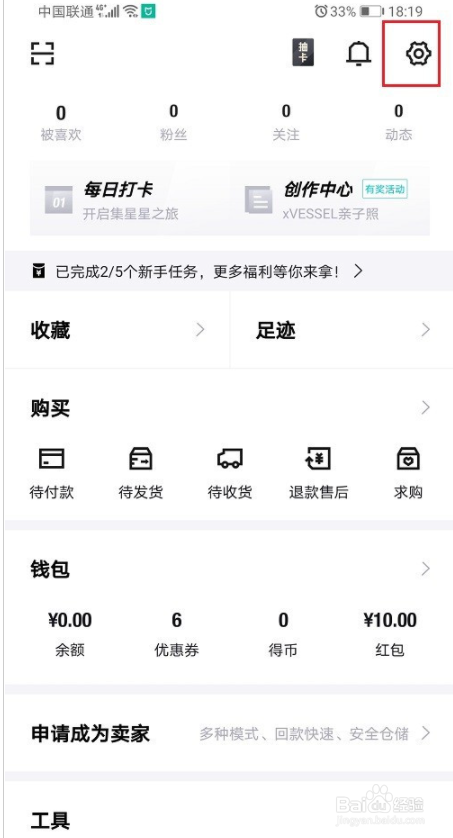 1/3分步阅读打开得物,进去我的界面,点击设置图标,如下图所示: