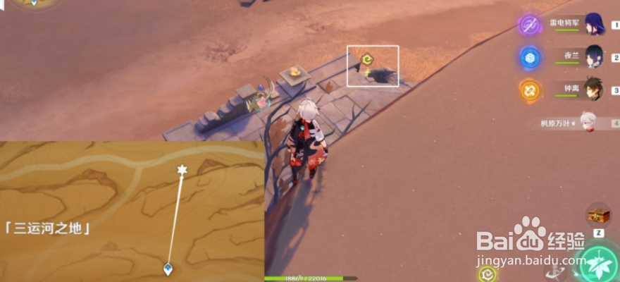 传棍三泪送三运河之地图中锚点,往地图的东北方向走,利用四叶印,前往图中指引遗迹入口。