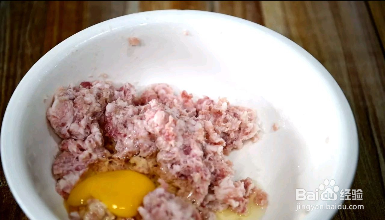 [图]2/5将肉馅放入盆中,加入少量的葱姜水、盐、料酒,顺一个方向进行搅拌;加入鸡蛋抓匀,加入淀粉搅拌均匀,使肉馅充分上劲。