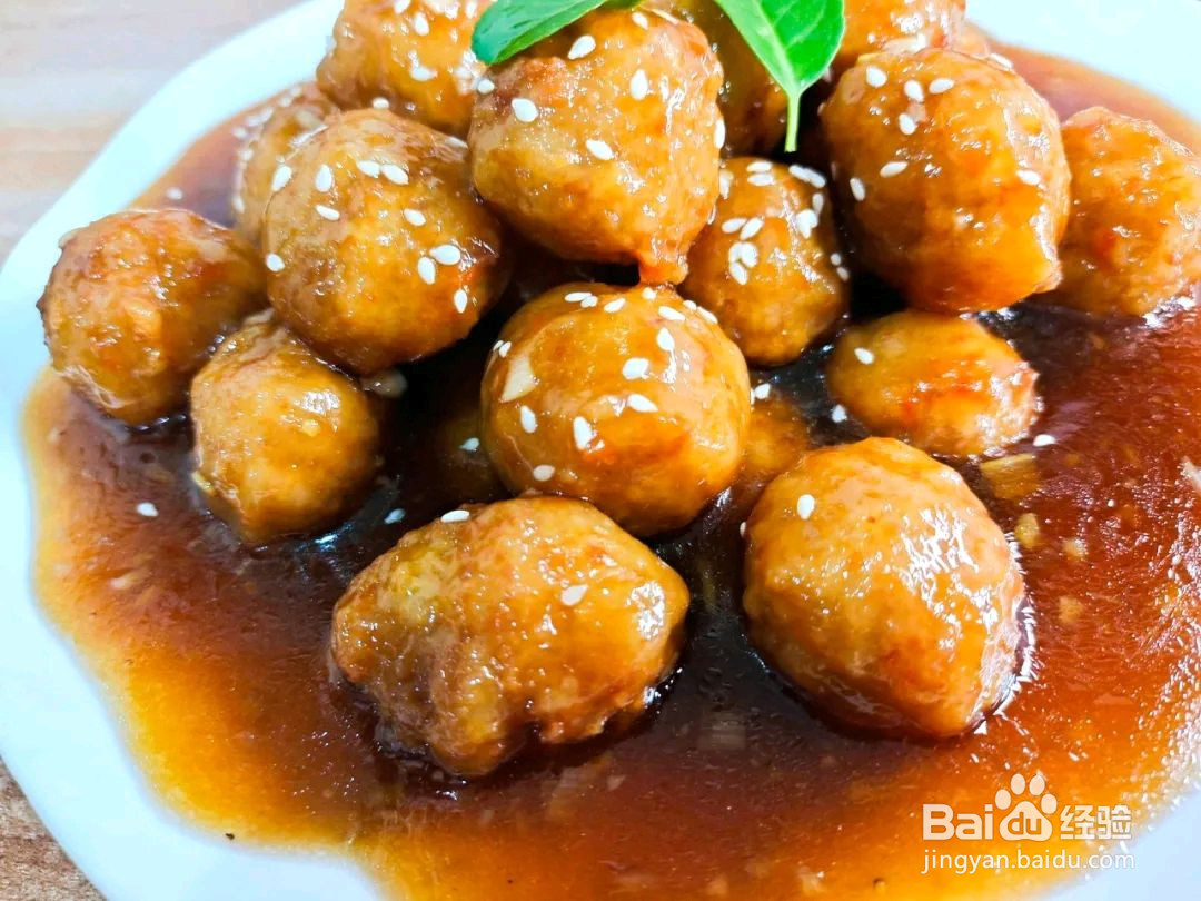 [图]4/5另起锅放底油,加入姜末、葱末、蒜末炒出香味,再加入陈醋、盐、白糖和适量清水,用水淀粉勾芡;加入少许明油,倒入肉丸子翻炒均匀。
