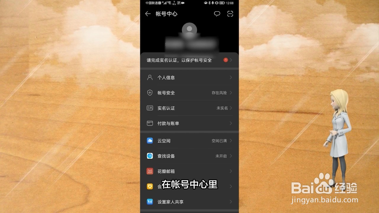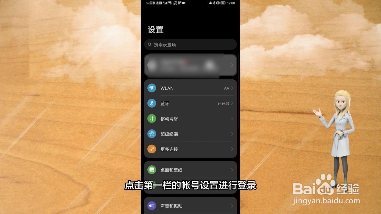 进入华为手机设置页面,点击第一栏的帐号设置进行登录。