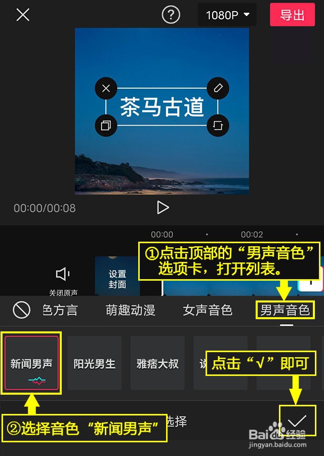 [图]9/9音色选择。点击顶部的“男声音色”选项卡,打开列表,选择音色“新闻男声”,点击右下角的“√”即可。
