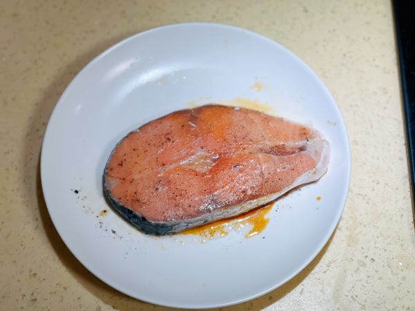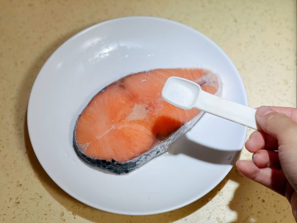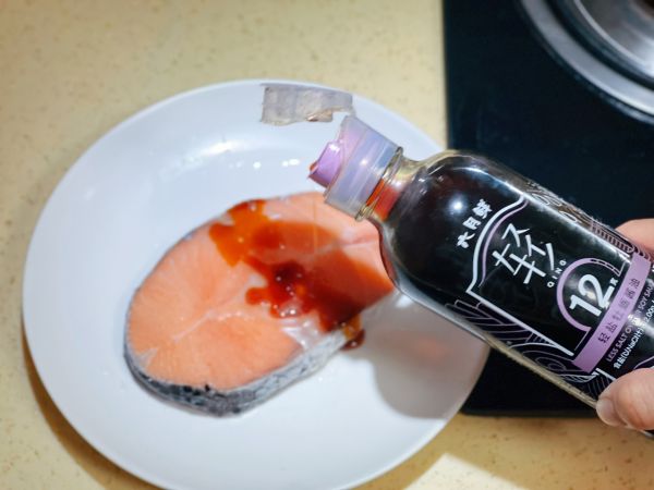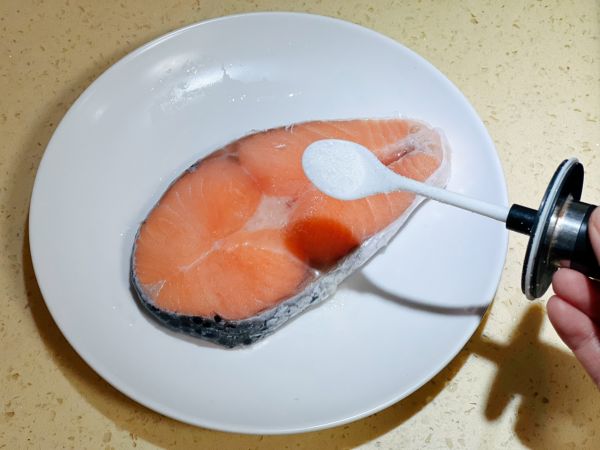 [图]6/16加入黑椒盐,把三文鱼排两边涂抹均匀,腌制15分钟;