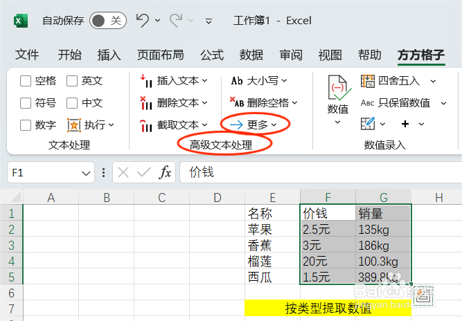 1/6分步阅读如图,我要提取下列单元格中的整数。首先,我们点击“方方格子”选项卡