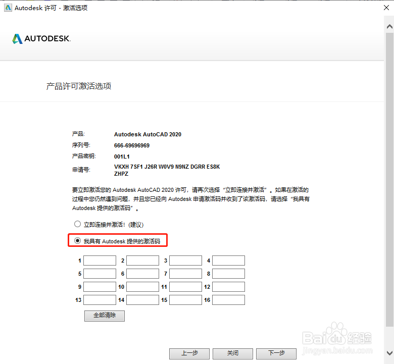 [图]15/20重复上述步骤进行激活,当输完产品密匙并点击【下一步】后会进入【产品许可激活选项】界面,选择【我具有 Autodesk 提供的激活码】