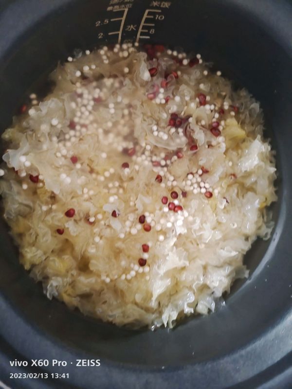 [图]4/6今天西米没有过凉水,吃起来没那么Q弹。加入黄冰糖块,喜欢甜的就多加几块。直接一起用电压力锅压,按煮饭功能,自动排气即可。