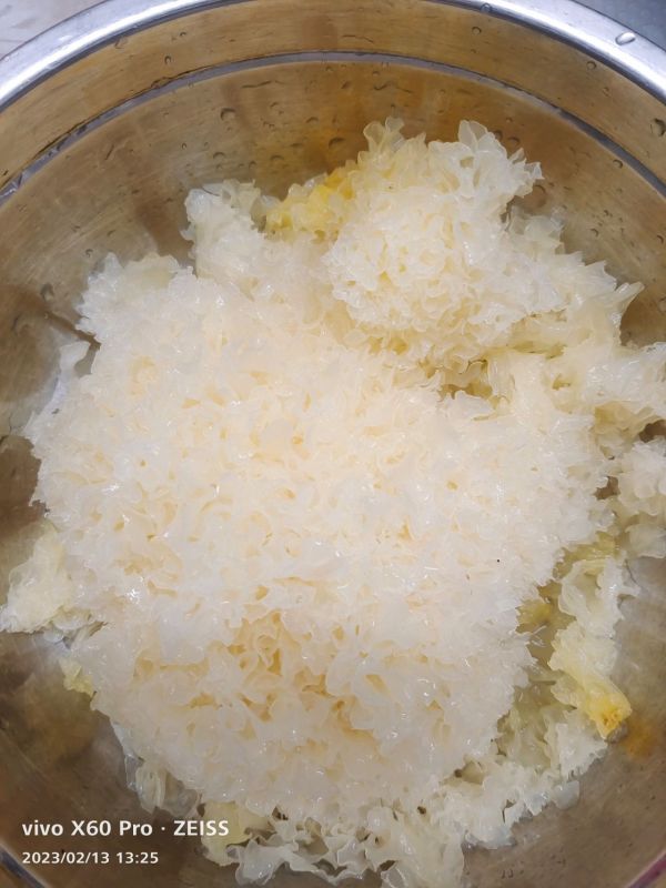 [图]2/6今天这个银耳有点大,银耳洗干净泡发,剪掉中间的心。用手掰成小块。