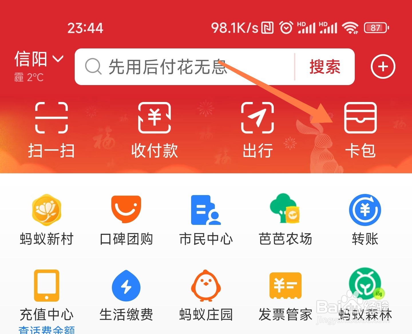 在支付宝中点击【卡包】。