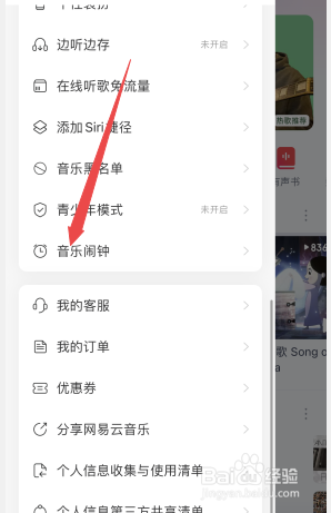 [图]2/5在左侧打开的列表选项中,点击“音乐闹钟”。