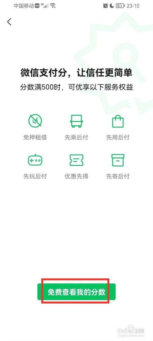[图]5/5进入到支付分界面,点击底部【免费查看我的分数】,即可查看微信支付积分