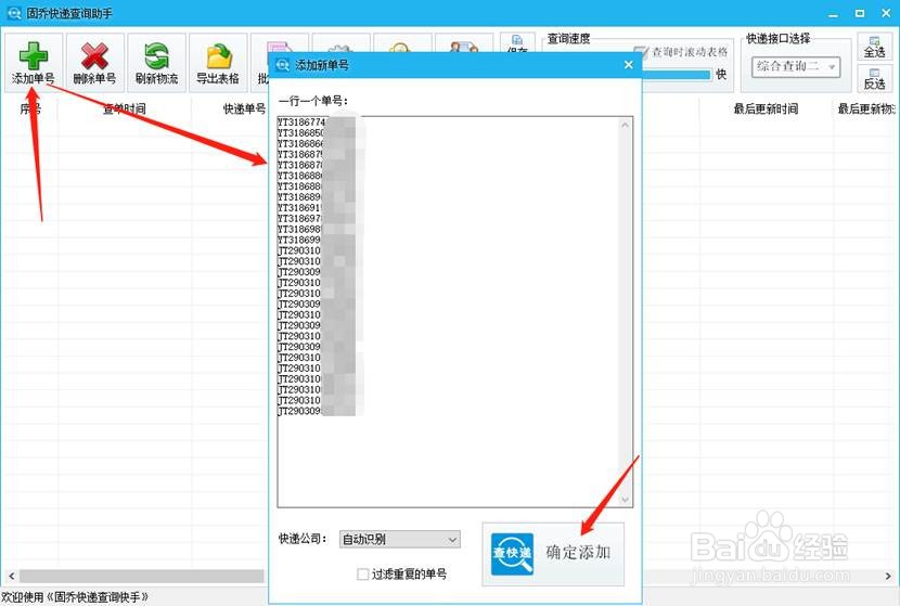 [图]4/64、我们直接将所有需要查询的单号复制进去就可以,以一行一个的格式,不同快递公司也可以,是可以自动识别混合查询的,点击确定添加就可以开始查询了。