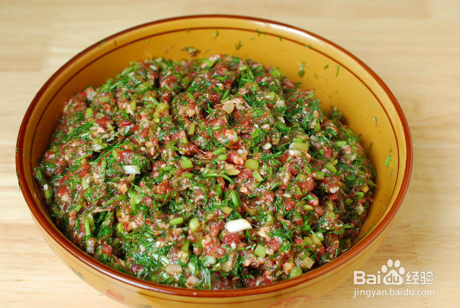 [图]3/15牛肉馅中加入盐(一次加足)、胡椒粉、生抽、老抽,顺着一个方向搅拌上劲儿。