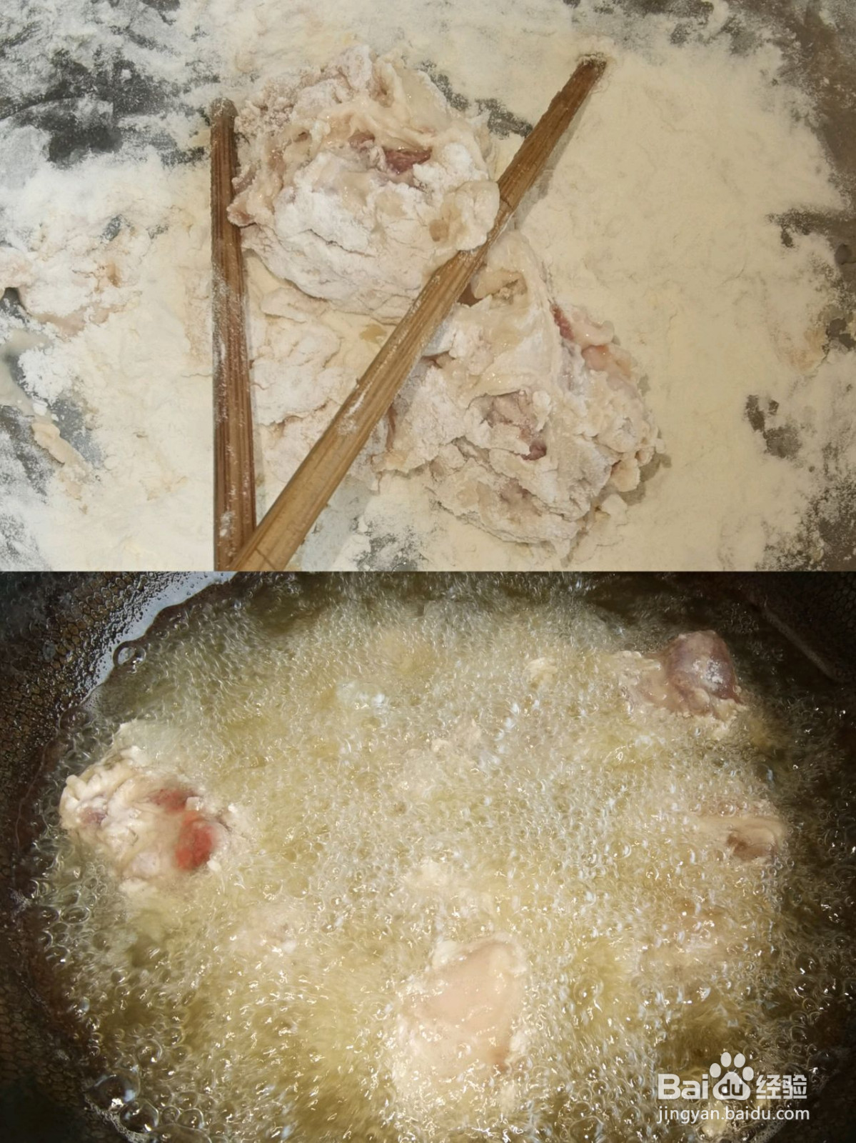 1/8分步阅读排骨裹上两种粉,放在热油里稍微把肉炸熟一下,第一次先捞起来。放凉后准备第二次复炸。第一次尽量避免不要炸焦。