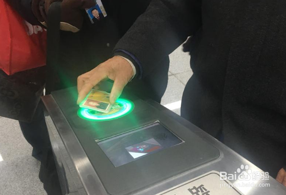 进站时右手刷卡,左侧通行,票卡在读卡器圆盘上停留片刻后,看到前方绿灯亮,显示器显示请进站及票价金额,确认金额后,向前推杆通过。