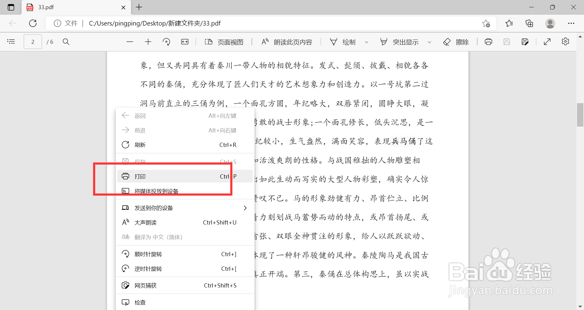 打开PDF文档,点击鼠标右键,选择“打印”。