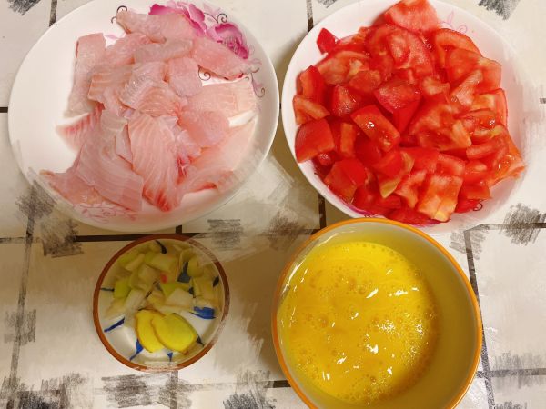 1/5分步阅读鲷鱼切块,西红柿一个切小块一个切大块,两个鸡蛋打散备用。