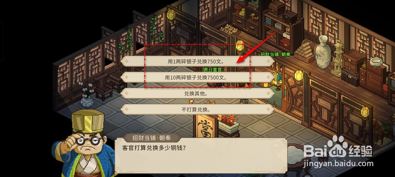 [图]4/4点击“用1两碎银子兑换750文”或“用10两碎银子兑换7500文”即可。
