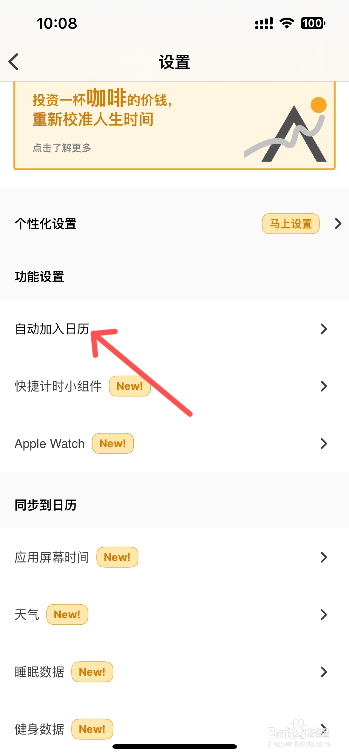 [图]2/4在设置列表中,在功能设置下点击【自动加入日历】