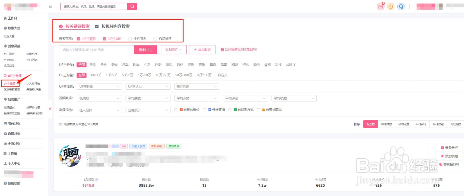 1/3分步阅读打开飞瓜数据B站首页,找到UP主查找功能,搜索所想查看数据的UP主
