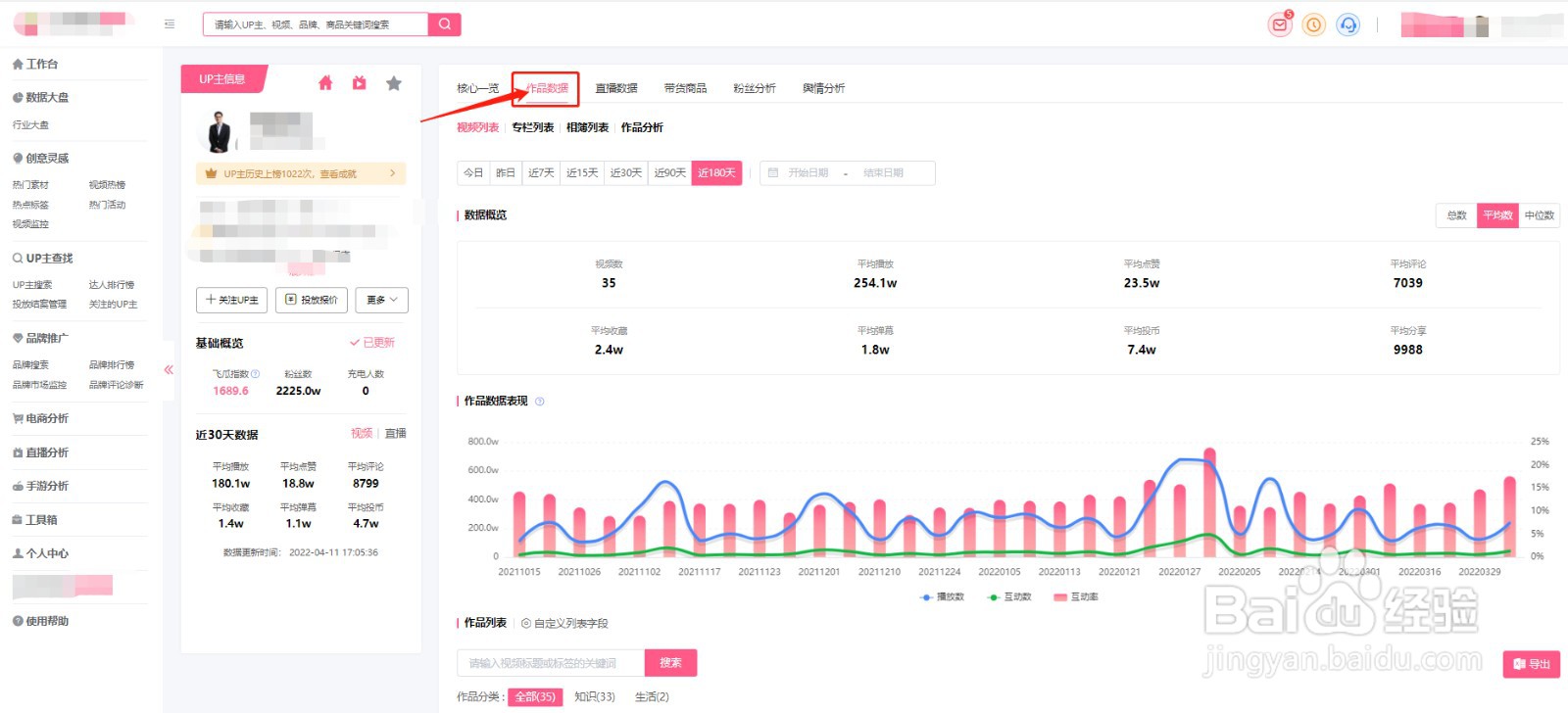 [图]2/3点击UP主头像,进入UP主信息页面,再点击作品数据功能,即可查看UP主作品数据表现,作品数据包含视频列表、专栏列表、相簿列表、作品分析,可通过日期筛选所想查找的视频