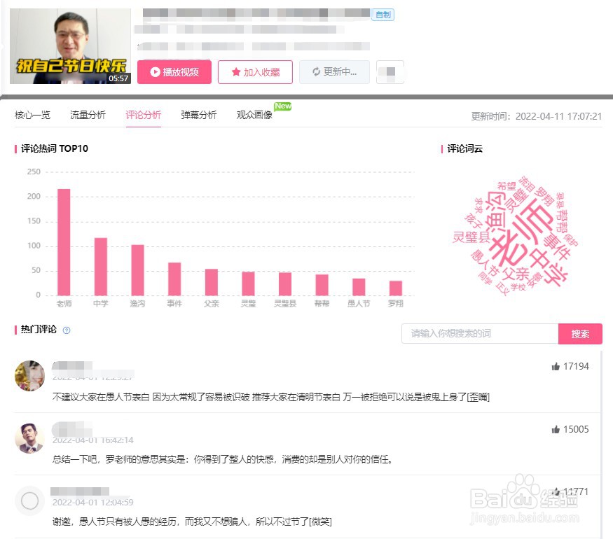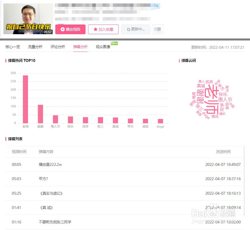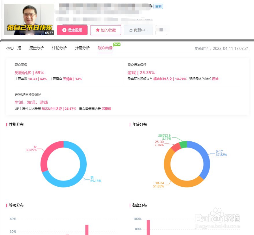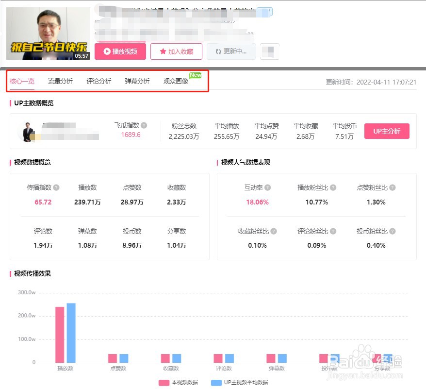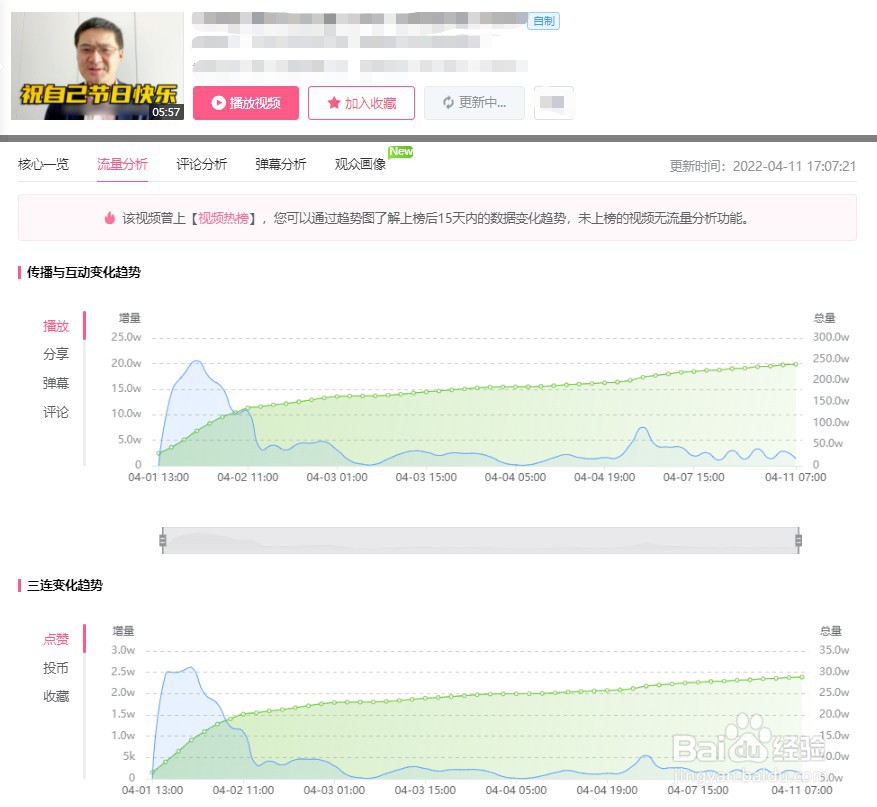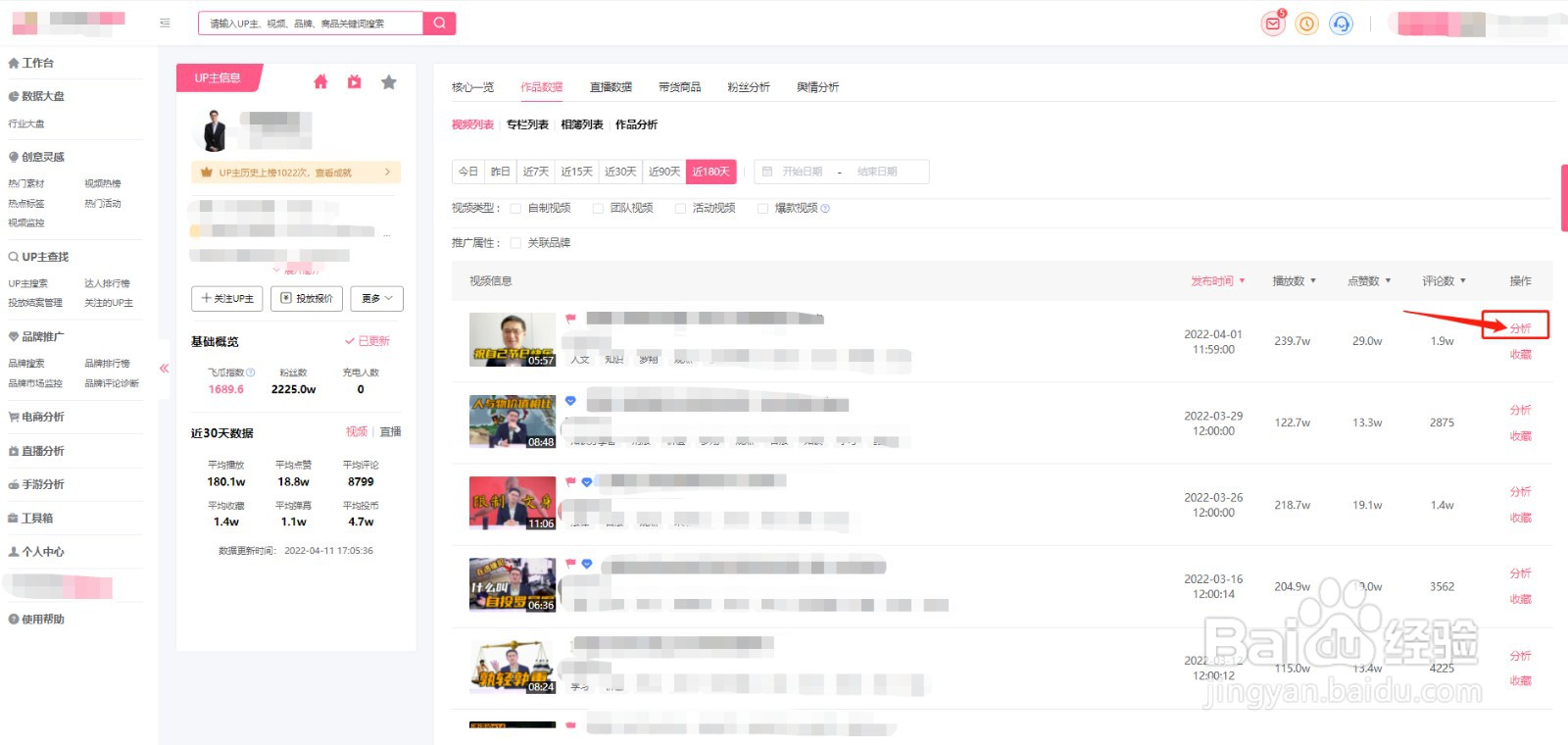 [图]3/3(4)找到想查看的作品,点击分析即可查看该作品的数据分析,视频分析包含核心一览、流量分析、评论分析、弹幕分析、观众画像