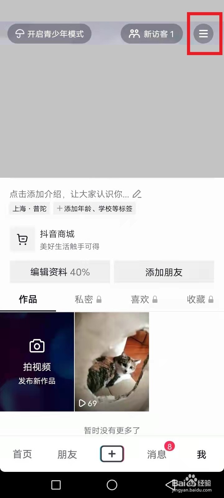 手机抖音app页面,点击右下角我,右上角三条杠更多。
