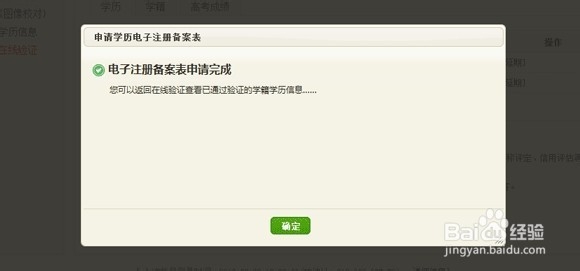 [图]7/9第六步,学历证书电子注册备案表申请完成,点击“辞趣确定”按钮回到在线验证栏目。