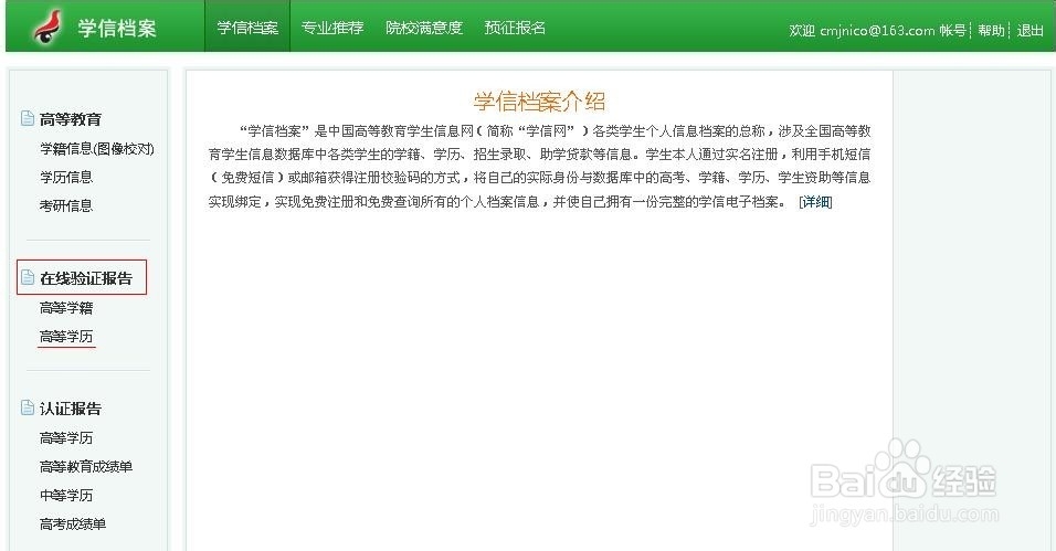 [图]3/9第三步,登录后,点击左侧菜单中的“在线验证”进入“高等学历”栏目。