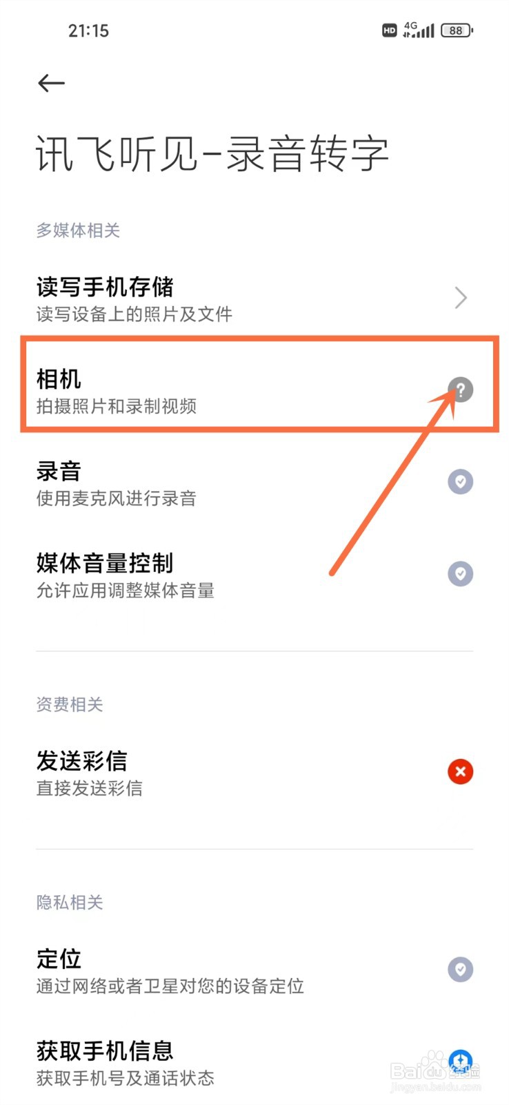 [图]4/5进入权限设置页,点击“相机权限”设置项。