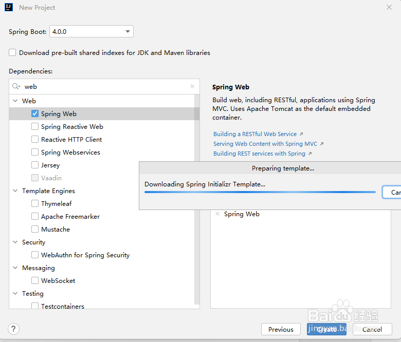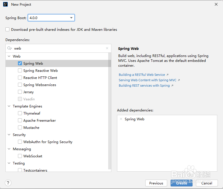 1/2在依赖搜索框中输入web,然后勾选Spring Web依赖。这是构建Web应用程序(如RESTful API)的基础。